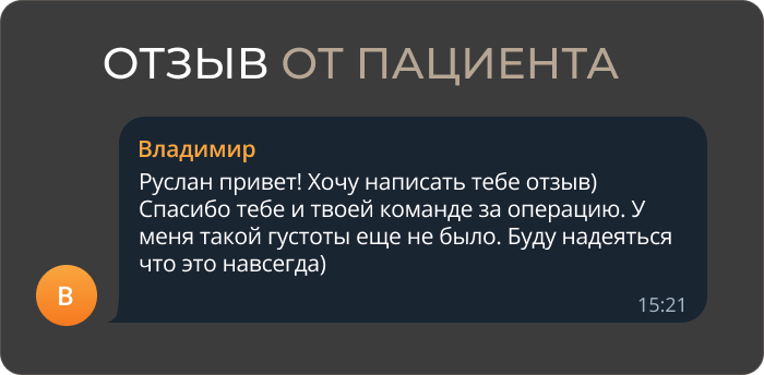 Операции прошли спокойно. Сперва просто ждал, потом — пошёл рост. К шестому месяцу результат уже радовал: более 97% графтов прижились, волосы смотрятся естественно и плотно.